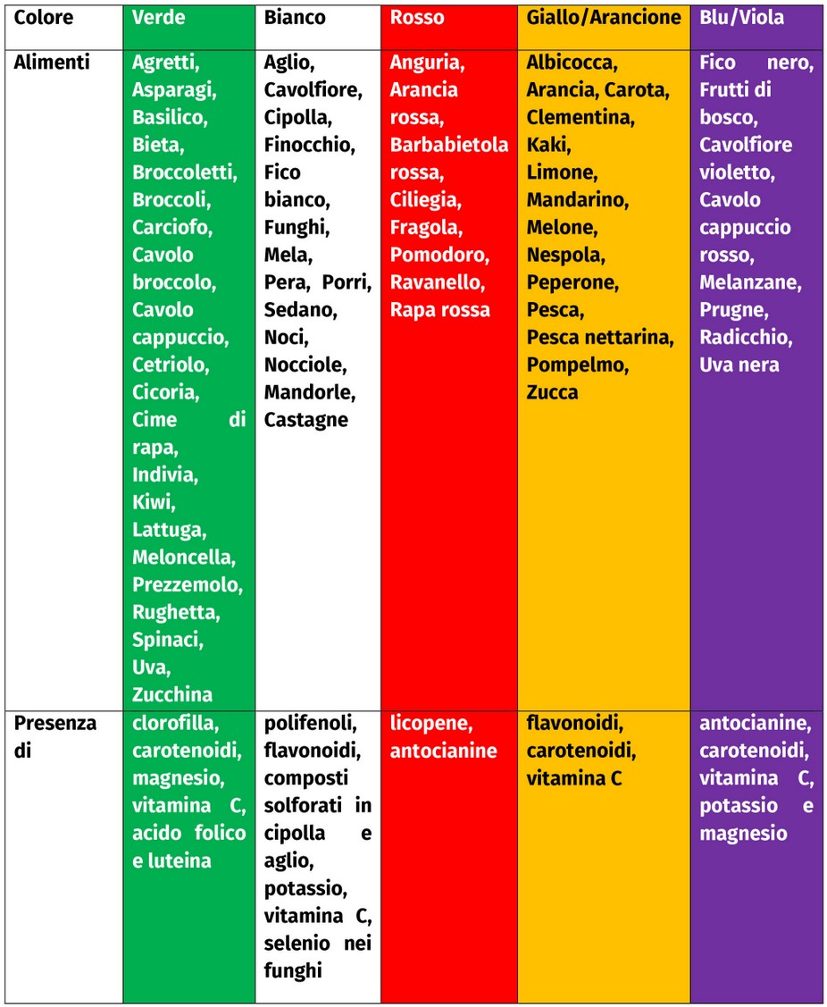 Oltre ad essere gustosi e ricchi di vitamine e minerali, la frutta e gli ortaggi hanno una composizione tale da svolgere un’azione protettiva e comunque funzionale al benessere dell’organismo. Questo avviene abbinando ad un basso apporto di energia, ottimo per mantenere la linea, un significativo apporto di fibre che aiuta la sensazione di sazietà. La presenza di polifenoli e flavonoidi conferisce a questi alimenti della terra colori vivaci e brillanti, un vero diletto per la vista, arricchendoli di preziose e differenti sostanze ad azione protettiva. I colori di riferimento sono cinque: il verde, il bianco, il rosso, il giallo/arancione ed infine il blu/viola ed a ciascuno di esso sono assimilati alimenti e proprietà, come semplificato nello schema sotto riportato.